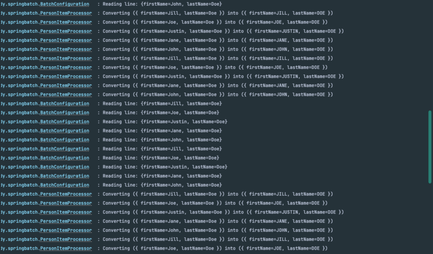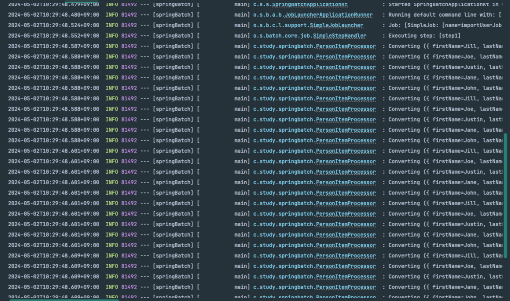 현재 chunk 단위를 10으로 해서 10개씩 데이터를 읽어, 처리한 다음, 쓰게 되는데 로그만 봤을 때는 10개씩 끊어서 보여주지 않기 때문에 chunk 단위로 잘 작업하는지 알 수 없다.