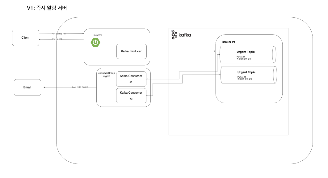 단순히 HTTP API로 받아온 데이터를 카프카와 연결해서 email을 전송해주는 consumer와 연결하는 구조이다.